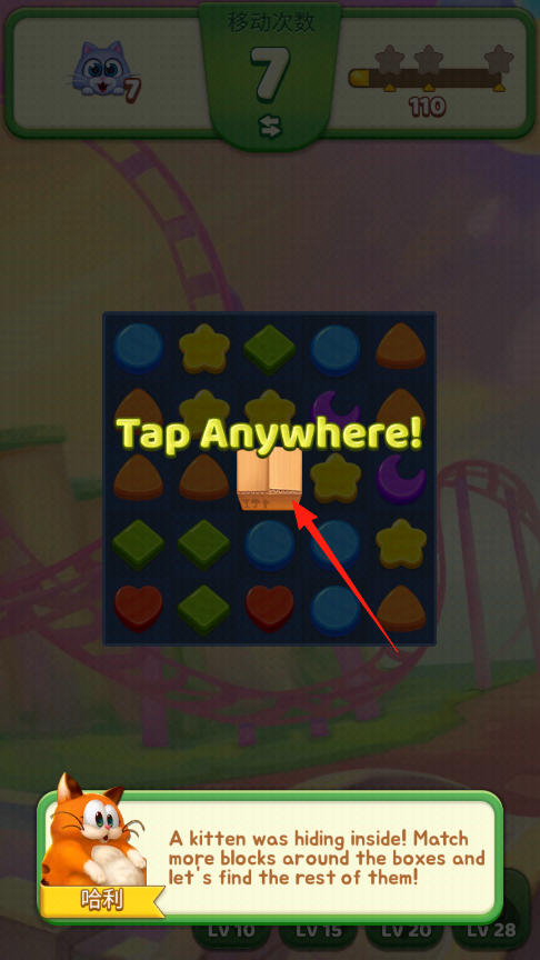 2、成功消除方块,盒子打开,出现提示Tap Anywhere,随便点一下屏幕,继续消除剩下的方块,把周围相同图案的都凑一起,完成关卡目标,争取多拿分数。