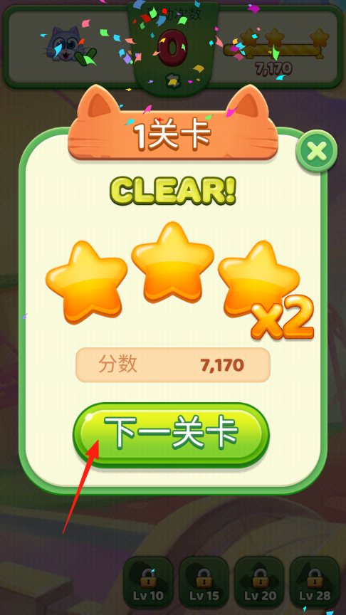 3、关卡完成,拿到三颗星和分数,想接着玩新关卡,点下一关卡按钮,进入下一关,继续挑战更难的消除,看看能拿多少分,能不能保持三星成绩。