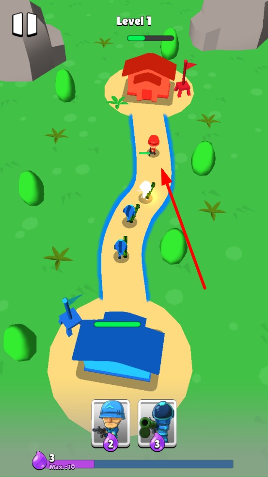 1、进入关卡后,消耗紫色资源召唤士兵、炮手,沿弯曲路线,向敌方据点推进,留意资源槽上限,避免溢出浪费。