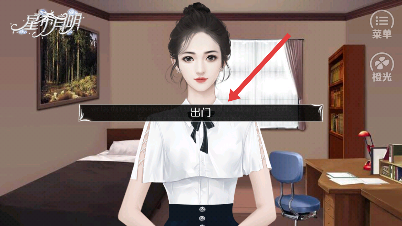 1、进入星希月明的游戏后,开始阅读剧情,出现选项点击出门的按钮,离开房间进入城市的地图。