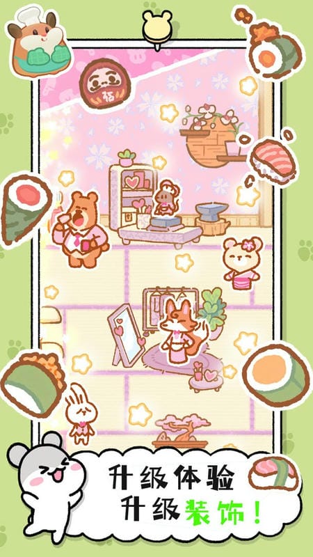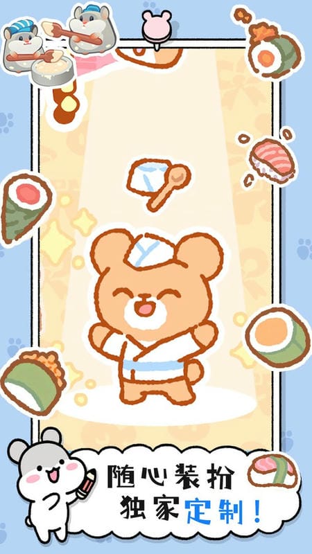 3、自由装扮系统:提供草莓围裙、小熊厨师帽、蝴蝶结领结等上百种装扮道具,可为小动物搭配不同风格服饰,如给小仓鼠穿黄色背带裤配红色头巾,打造专属可爱形象。