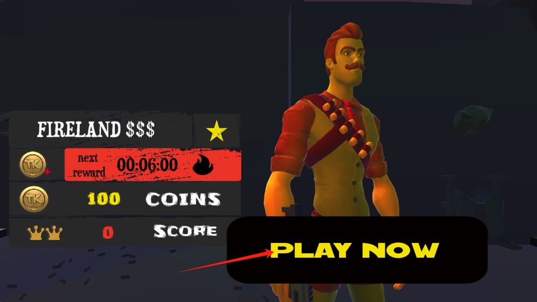 1、启动界面,点击PLAY-NOW,开启FIRELAND-$$$的冒险,进入游戏场景,点击开始游戏。
