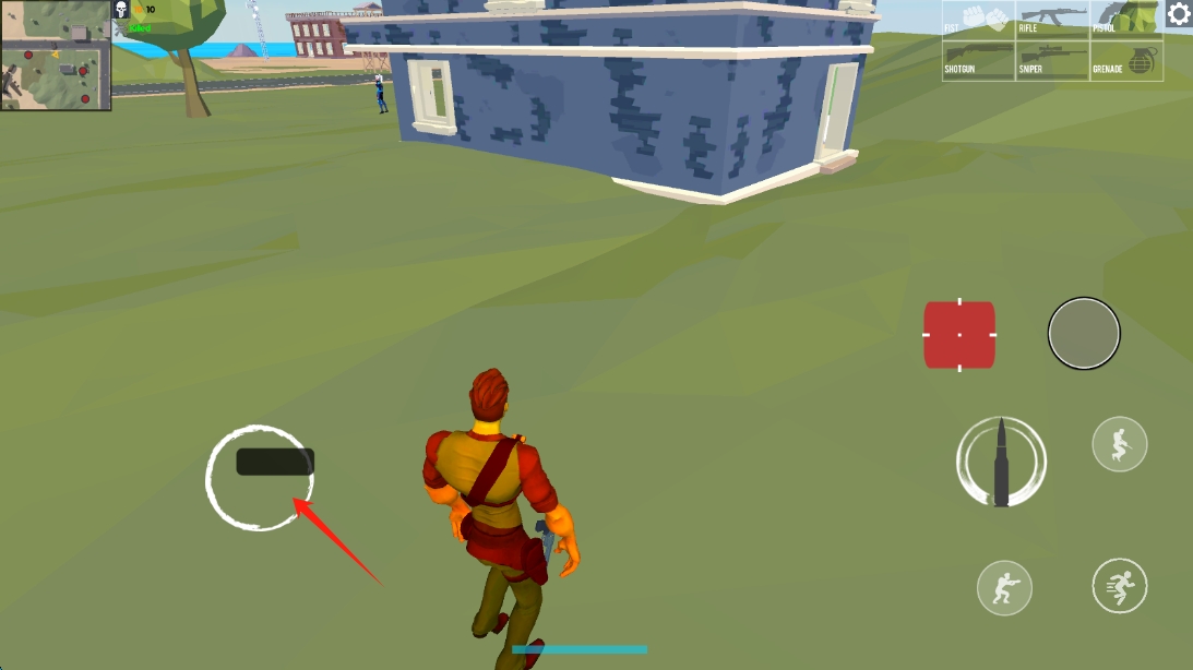 2、场景界面,用左侧虚拟摇杆,操控角色移动,靠近蓝色建筑,探索场景,拨动轮盘移动。
