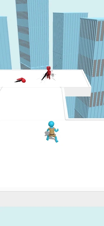 1、垂直天台战场:采用3D建模构建摩天楼环绕的天台场景,以极简白蓝配色突出战斗主体,高空坠落的视觉压迫与狭小平台的攻防博弈,放大操作专注度。