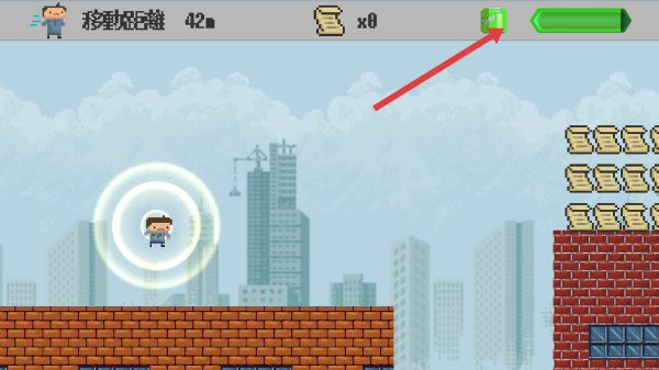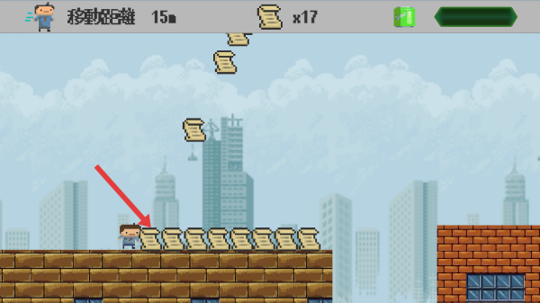 2、遇到障碍如前方砖墙,找准移动的时机在边缘处立刻跳跃,借助浮空卷轴,延长滞空,顺利跨越。