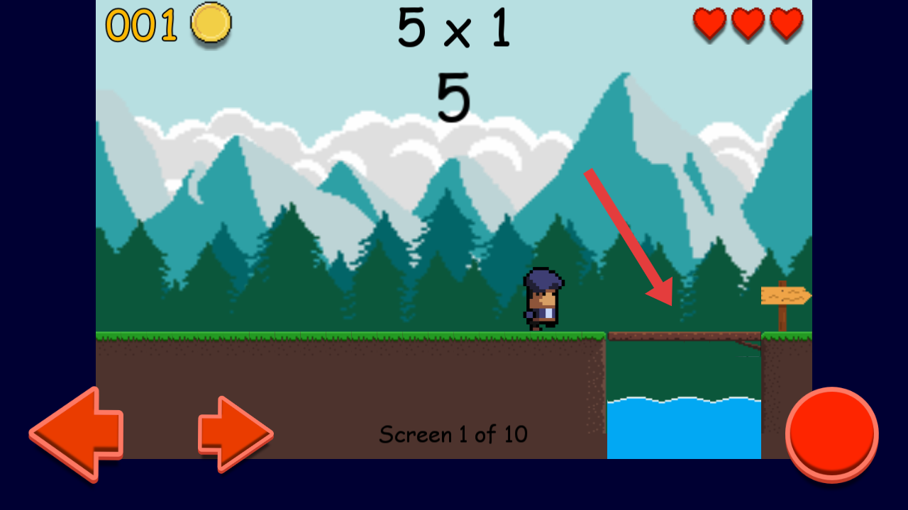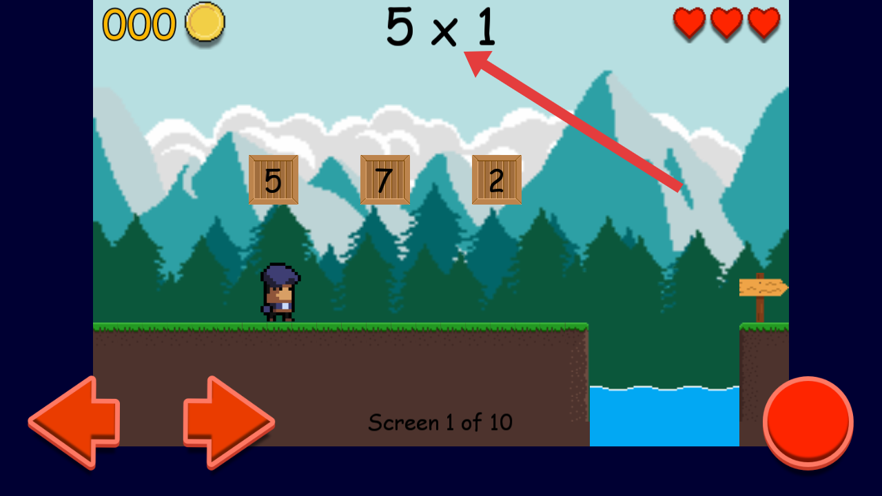 2、操控角色左右箭头移动打破标5的木箱,使上方5×1运算结果5显现,同时收集金币,提升左上角计数。