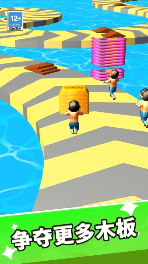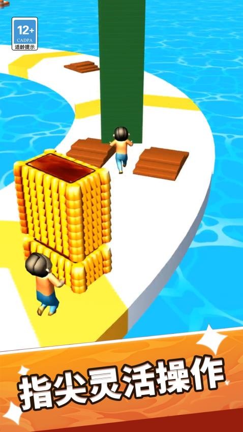 1、核心操作简单直观,通过滑动控制角色移动方向,点击放置收集到的木板。随着进度解锁二段跳、快速转身等进阶动作,应对更复杂的地形。