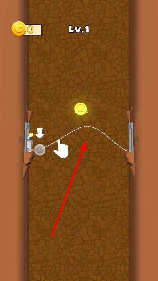 1、长按弹弓区域拖动,白色虚线提示矿车轨迹,观察金币位置,让矿车落点覆盖金币,同时滑向终点。