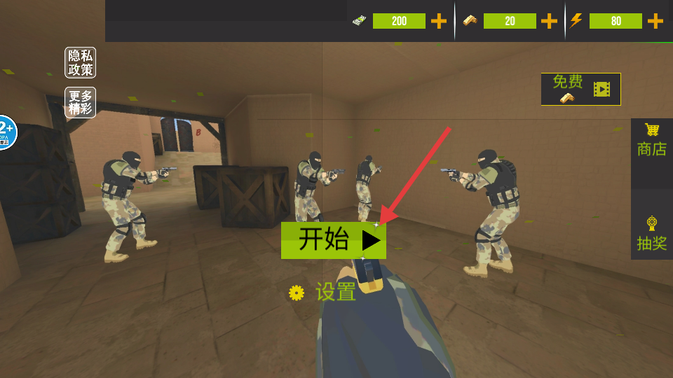 1、选择初始装备后空降随机战场,搜集场景中的武器道具强化战力。