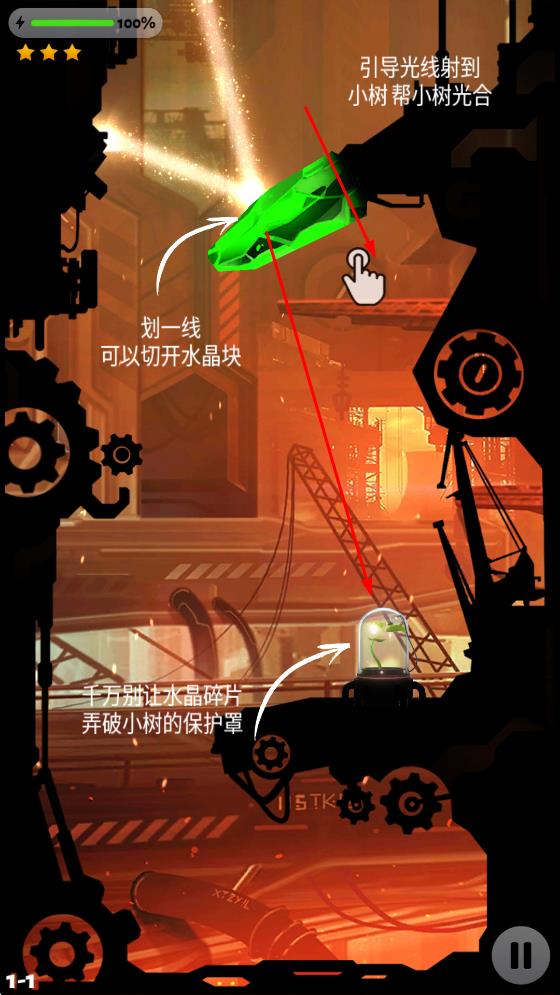 3、规避水晶碎片撞击保护罩,精准操控切割与折射,让光线成功抵达小树。