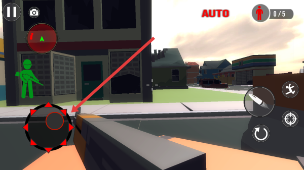 3、滑动左下角的瞄准环方向盘移动角色,瞄准目标后利用武器展开攻击,推进关卡的战斗进程。