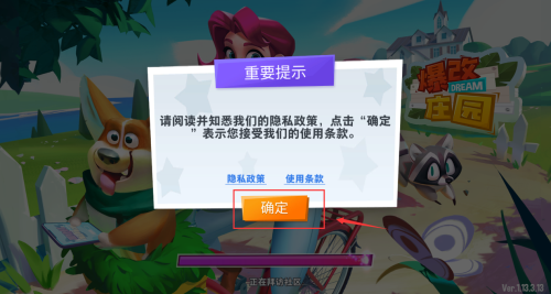 2、点击红框确定按钮,确认隐私政策开始游戏。
