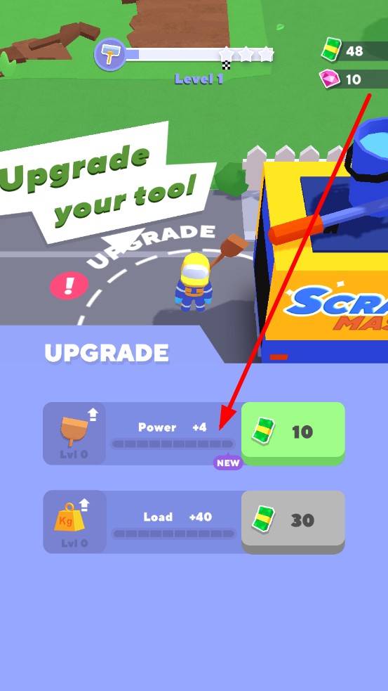 2、售卖后获得金币,玩家可以使用金币对属性进行升级,提升力气或者背包容量,增强挖掘效率。