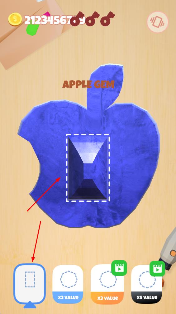 1、进入游戏界面,点击下方方形工具,在苹果轮廓内框选宝石区域,开启切割流程。