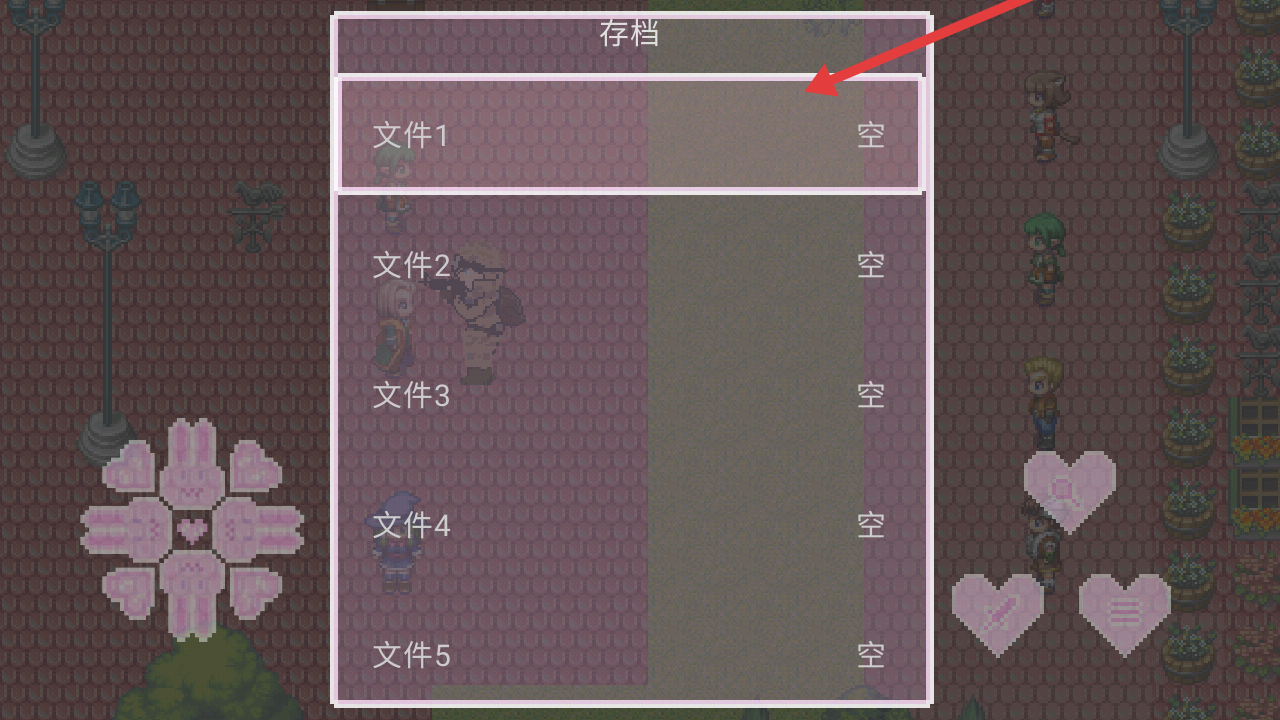 1、进入存档的界面后,需要选择文件1这个空白档进行存档当前的游戏进度,存档成功后回到游戏游玩。
