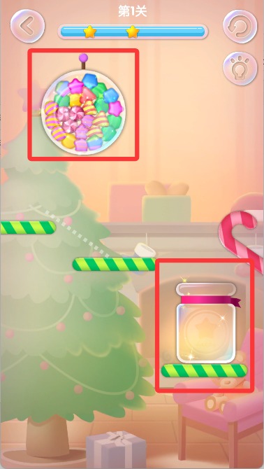 1、进入关卡后需通过滑动手指画出路线,控制糖果按照设定路径滑落,最终顺利掉入底部的瓶中即为达成目标。