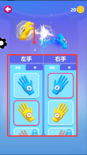 2、每关前可以更换不同的手套,每种手套有独特技能,比如爆发或防御,根据敌人类型挑选合适的能提高胜率。