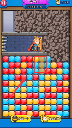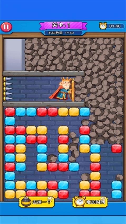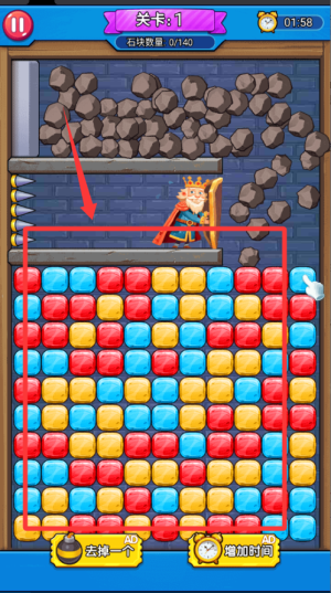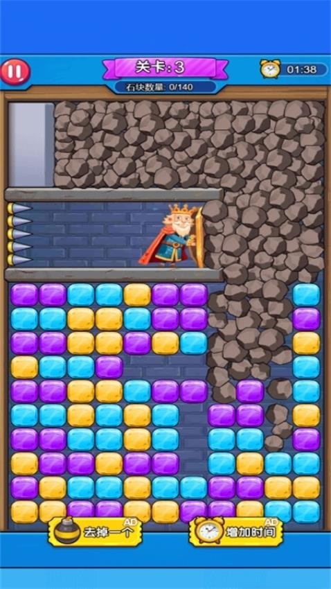 2、通过消除钻石来清理路障或解除陷阱,每一步都要想好后续连消机会,合理规划才能顺利救出国王完成任务。