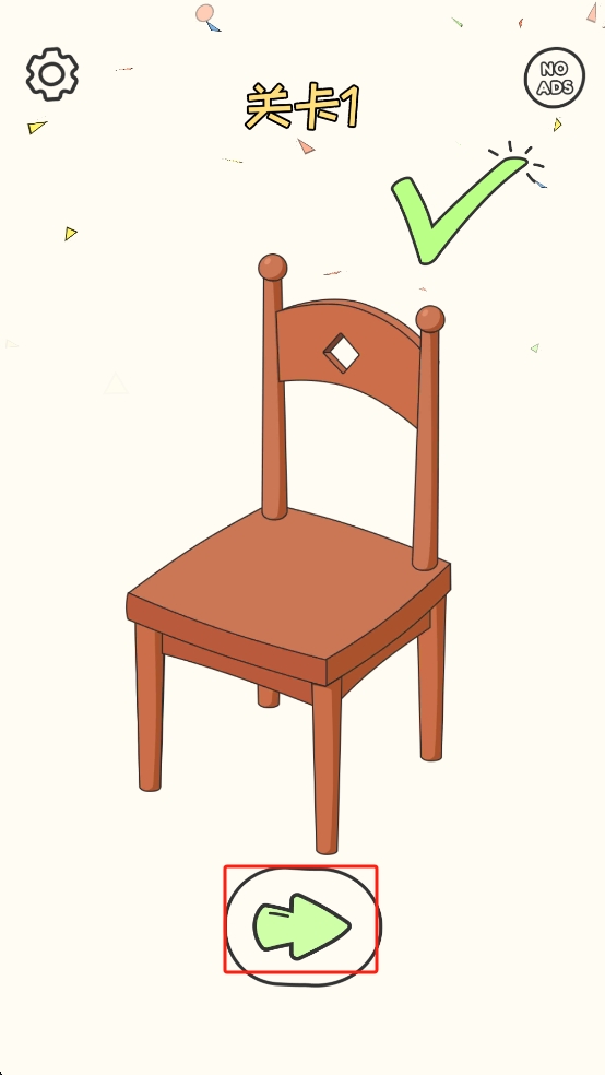 3、当椅子成功修复,画面出现绿色对勾确认,此时点击下方绿色箭头按钮,就能顺利进入下一关,迎接新的家具修复挑战。