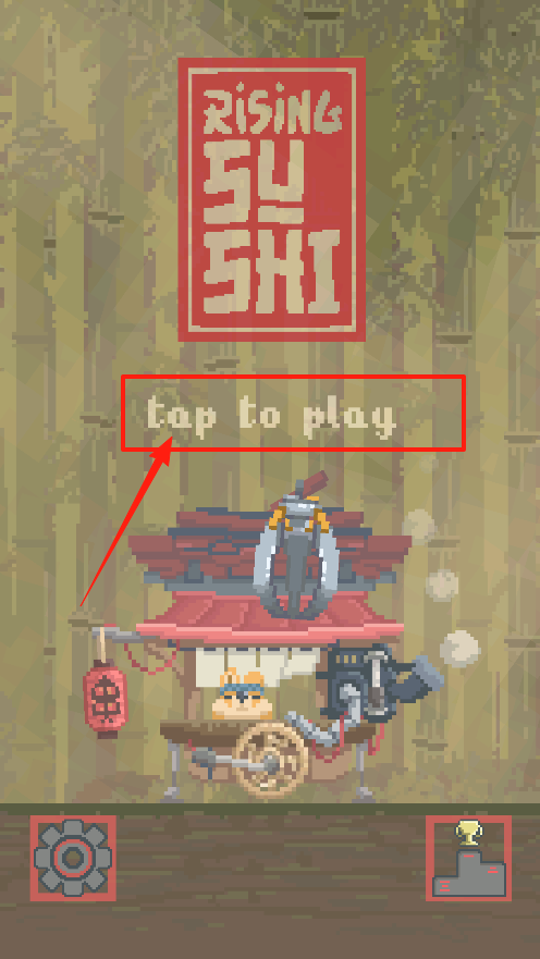 1、看到RISING SUSHI标题和tap to play提示,点一下屏幕开启寿司冒险,进入游戏后,操控寿司在关卡里移动,准备应对各种机关收集食材,完成挑战。