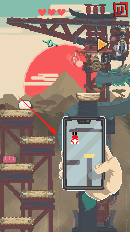 2、进入关卡,画面有手机里的小寿司和轨道,点击屏幕让寿司在轨道上跳,避开障碍沿着传送带往前跑,还要注意收集道具,借助场景里的机械装置往更高处前进。