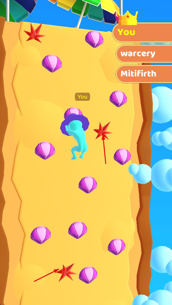 1、操控角色抓取紫色贝壳移动,避开红色海星障碍,沿沙滩向上攀爬。