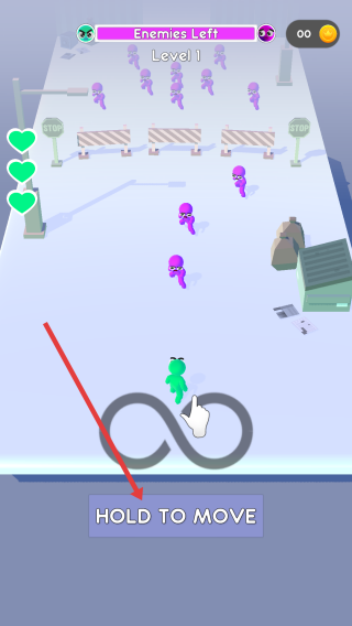 1、进入Level1关卡,长按HOLD TO MOVE按钮,操控绿色角色沿道路移动,准备对抗紫色敌人。