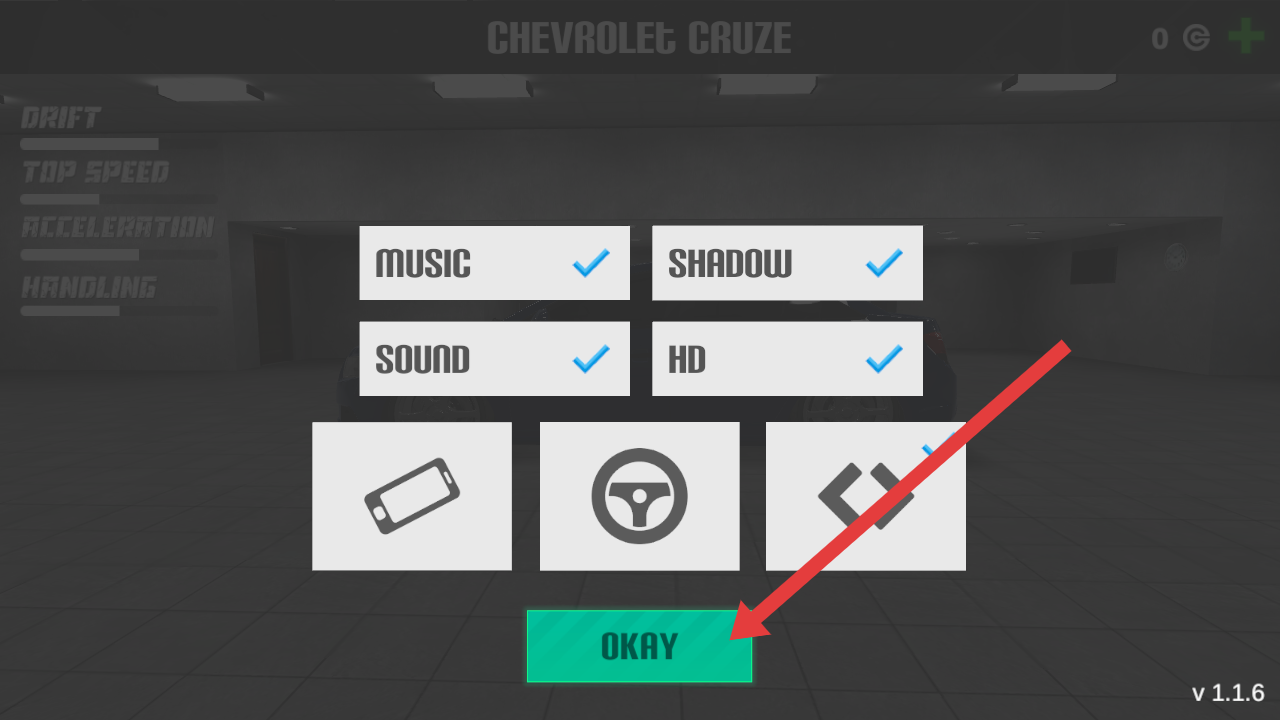 1、进入游戏主界面后,点击设置按钮,确认游戏内音乐、阴影等设置,最后再点击绿色OKAY的按钮。