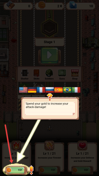 1、进入游戏界面,点击左下角标有151的攻击伤害升级按钮,消耗金币提升攻击伤害,强化战斗能力。