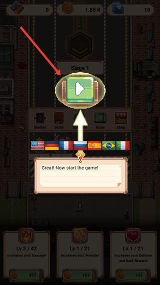 2、完成升级后,点击Stage1下方绿色带播放图标的按钮,正式开启第一阶段游戏关卡。