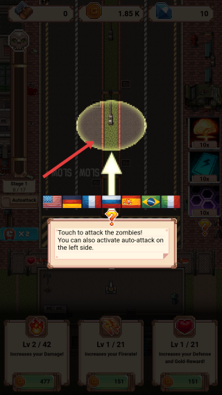 3、进入关卡,依据提示触摸道路区域攻击僵尸,也可开启左侧自动攻击,沿道路推进消灭僵尸,完成关卡挑战。