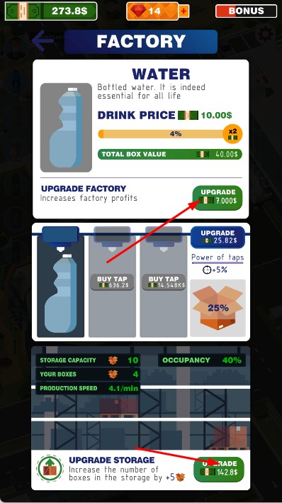 2、工厂建成后,进入工厂界面,可看到饮品售价,每箱价值,点击UPGRADE按钮,升级水龙头功率,花费资金提升生产效率、存储能力,增加工厂收益。