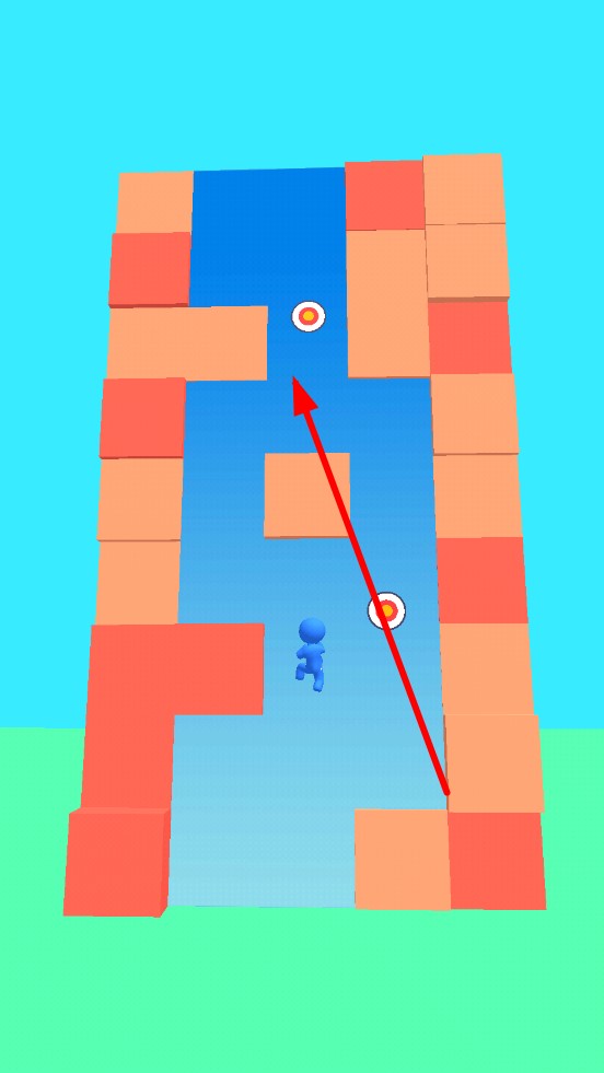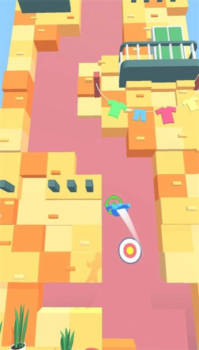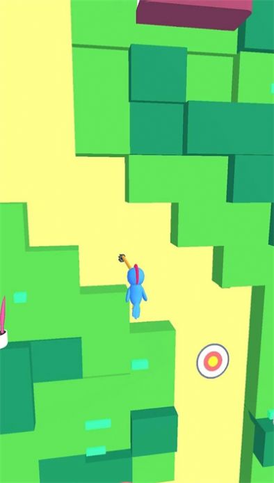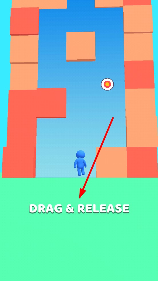 3、视觉清新明快:彩色砖块与蓝天背景构成简洁画面,小人的蓝色与靶心的红白对比鲜明,低多边形风格降低视觉负担,让玩家专注弹射解谜本身。