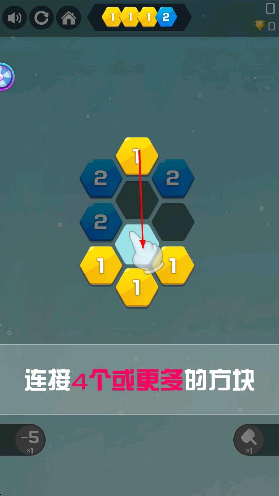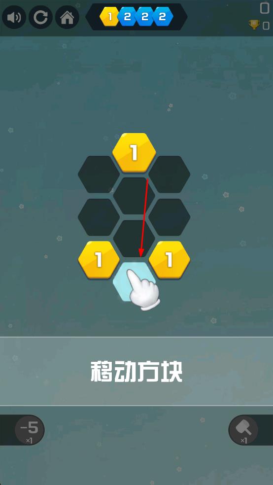 1、点击移动合理布局:进入游戏后,点击需要移动的方块,选择合适的相邻位置移动,确保方块在六边形格子中合理分布,为后续合成创造条件,操作便捷性让玩家能快速调整布局。