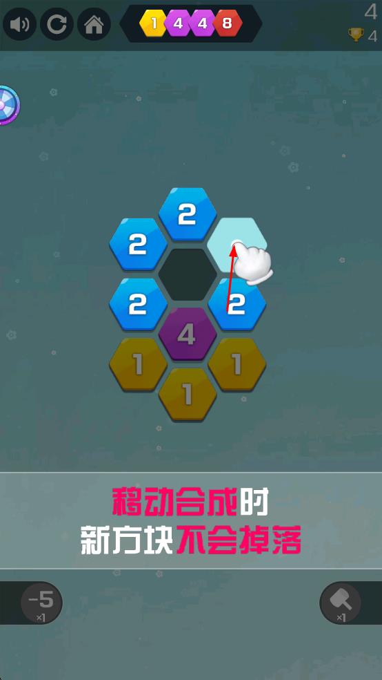 2、聚集相同合成升级:当四个或更多相同数字的方块聚集时,会自动合成更大数字并获对应分数,玩家需通过移动引导相同方块聚集,利用六边形空间特性提升合成成功率。