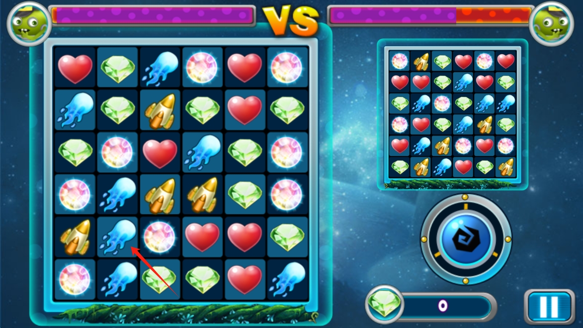 3、对战画面,交换相邻图标,消除同类型元素,积累分数,击败对手,滑动消除相同的方块。