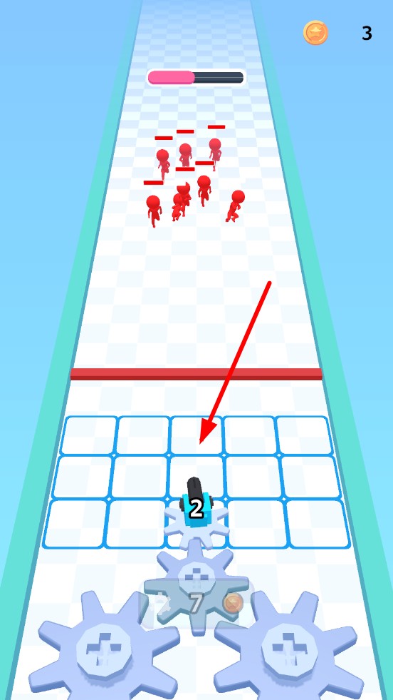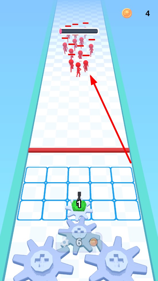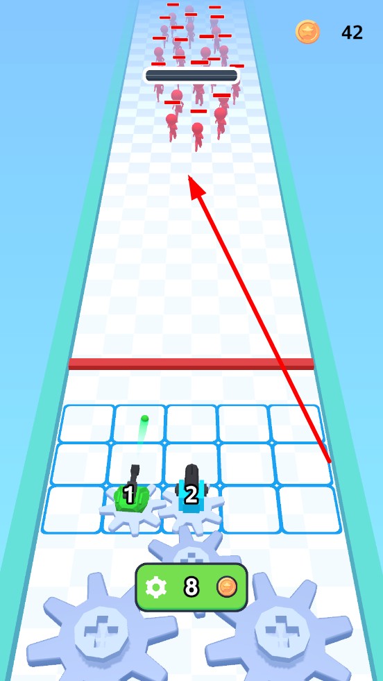 1、进入关卡,点击下方带数字的齿轮放置到方格区,在通道前进行布局,用一级齿轮,构建基础防线,射击靠近的红色小人。