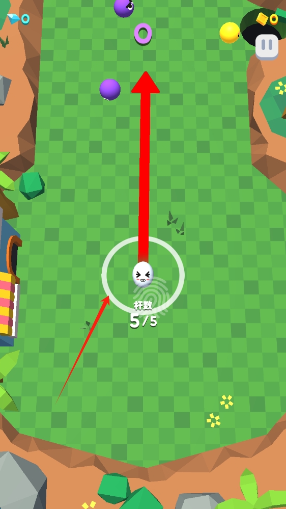 1、击球界面,滑动屏幕,控制白球方向,用5次杆数,精准撞击目标球,按住滑动人物。
