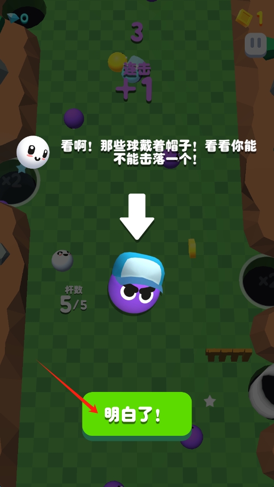 2、提示界面,点击明白了,开启击落戴帽紫球挑战,调整击球策略,点击确认游戏规则。