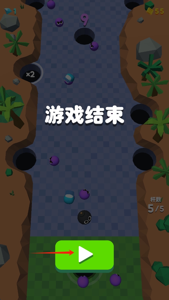 3、游戏结束,点击绿色按钮,重新开始,积累经验,提升撞击得分,点击进入下一关。