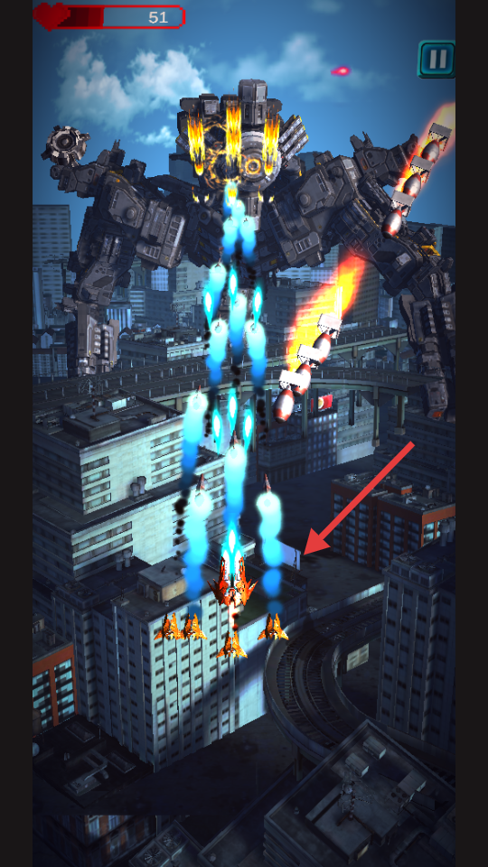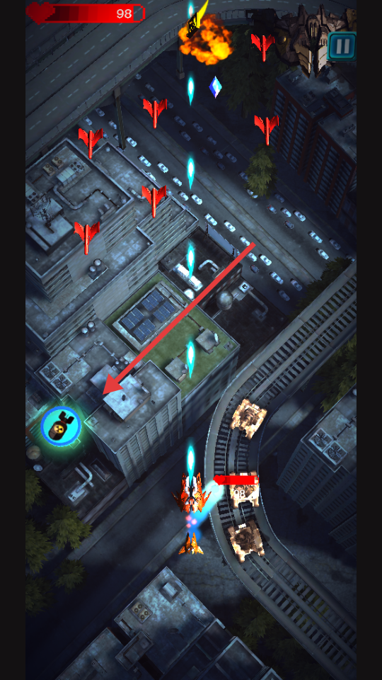 1、滑动屏幕控制战机移动,自动攻击范围内敌人。
