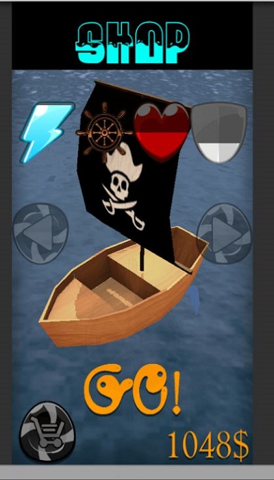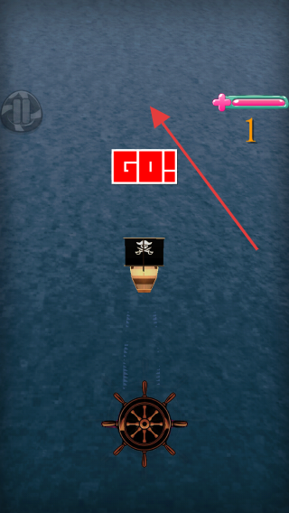 2、游戏开始,看到“GO!”提示,通过下方船舵操控船只方向,按箭头指引,驾驶海盗船在海面前行,注意避开障碍。