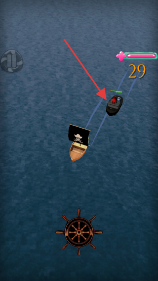 3、航行中,依据箭头指示,调整船舵让船移动,接近目标物如黑色小船,同时留意上方血量与数字,完成关卡任务。