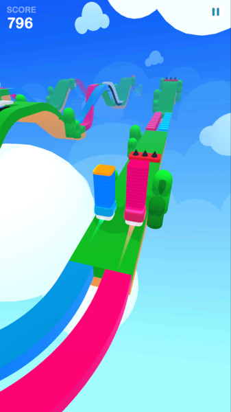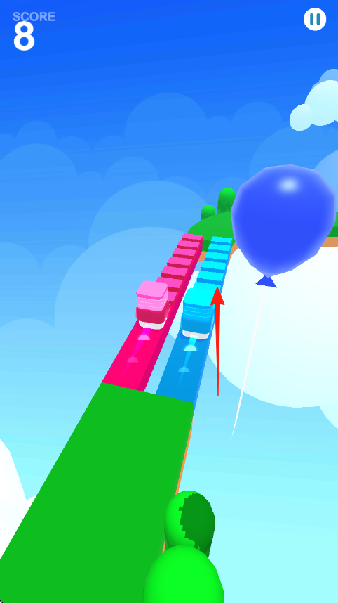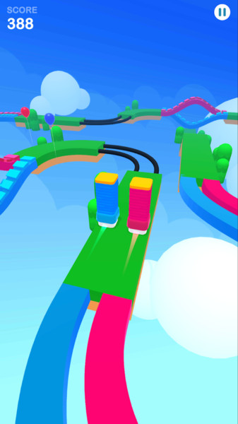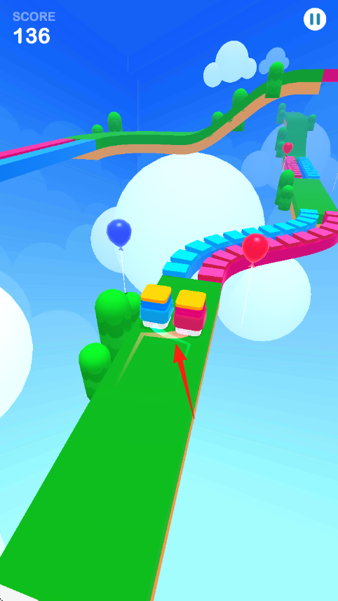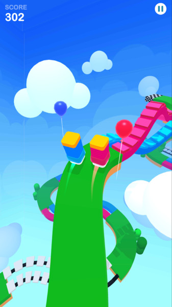 2、引导彩色方块沿轨道跑,避气球等障碍,按颜色走对应路,积累分数,冲向终点。