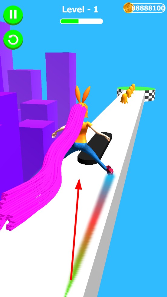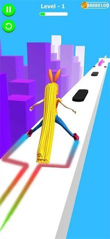3、视觉沉浸游玩:发丝从短到长如彩虹流动,冲刺时长发飘扬成“移动绸缎”,搭配炫彩赛道、通关烟花,跑酷过程像动态发型秀,解压又吸睛。