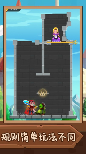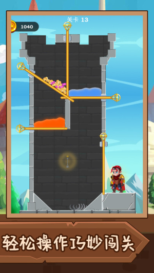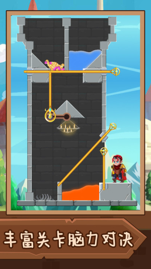 1、玩家在游戏中需要通过拉针的方式,按照正确的步骤拔掉棍子,解救被困的公主,思考拉针的顺序和时机。