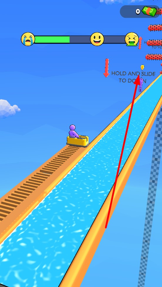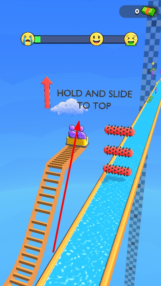 1、进入关卡后,滑车会沿水滑道自动启动,按压屏幕,进行上下滑动,可操控滑车攀爬楼梯提升高度,规划基本的闯关路线。