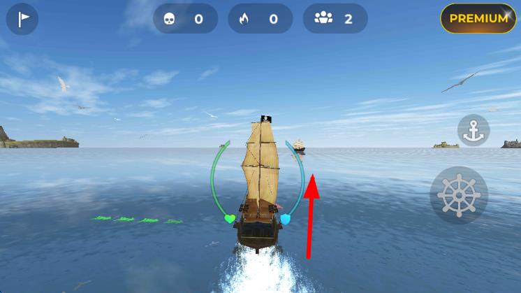 1、进入游戏后选择初始海盗船,熟悉船只操控方式与海域地图,驾驶船只在海上航行,寻找带有资源标识的商船目标。