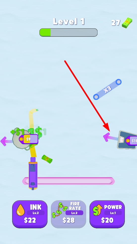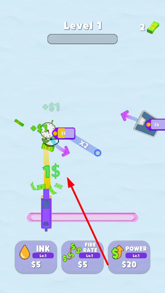 1、进入关卡后,滑动紫色喷枪,绘画出轨迹,让物品触碰到紫色喷枪的轨迹上,能够收获更多金币。