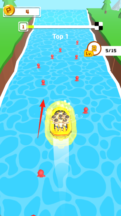 1、操控黄色木筏沿箭头方向,避红色章鱼,吃金币,保持Top1,冲向终点,推进关卡。
